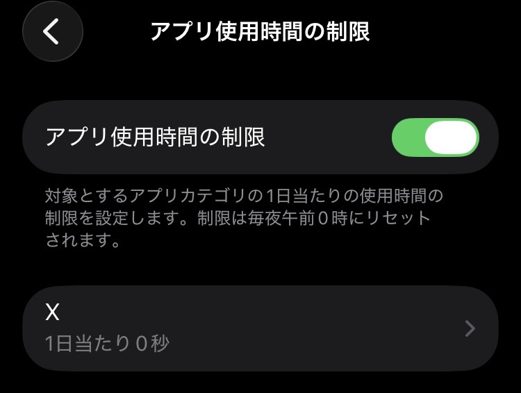 制限としては、iOSの「アプリ使用時間の制限」で時間制限を設定します。